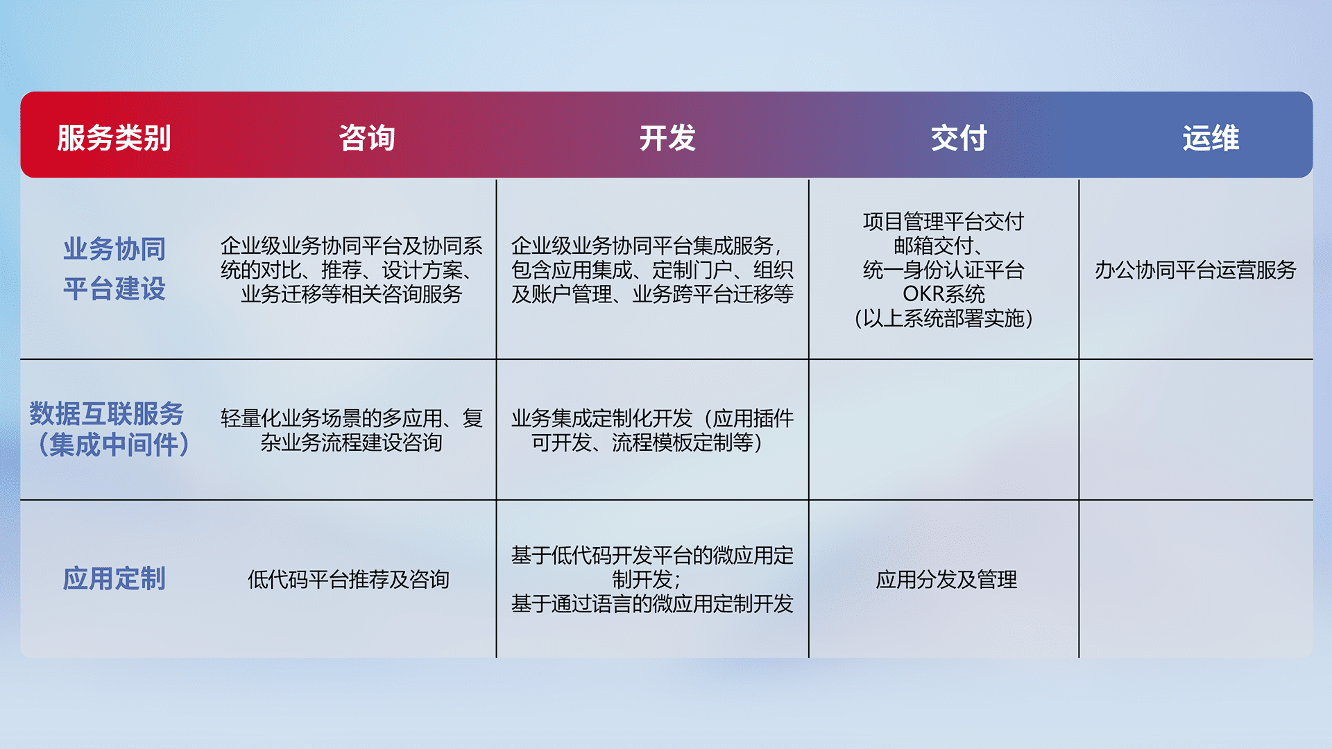针对钉钉、、、企微、、IDaas等平台级产品提供产品的规划、、、、方案、、交付、、定制化开发等服务,,,实现如统一协同办公、、、、智能客户服务、、、、混合会议管理、、智能数据查询、、、、等业务场景,,实现数字化转型。。。。